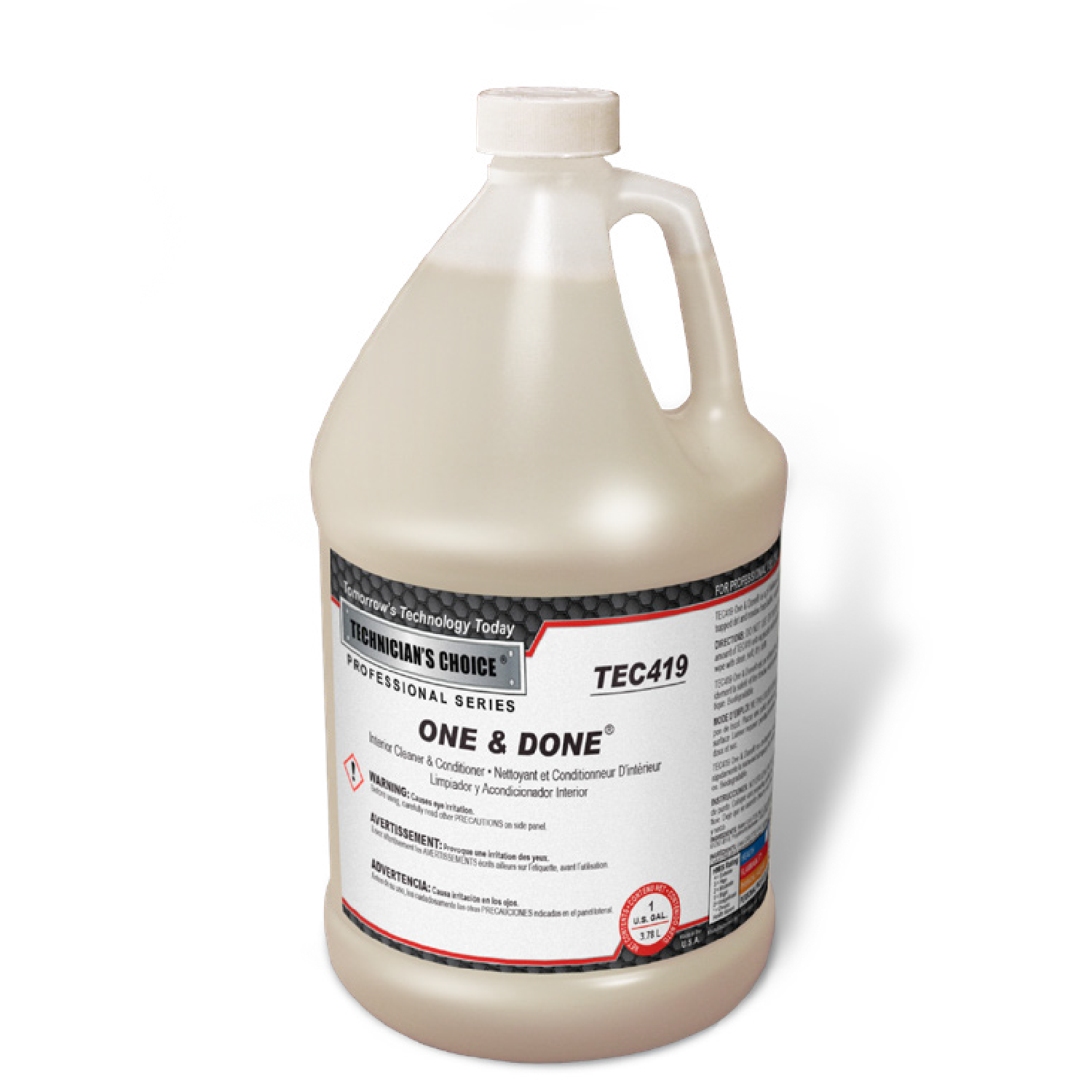 Introducing Technician’s Choice® TEC419 One & Done Interior Cleaner & Conditioner… is a pH balanced, water based cleaner & conditioner which quickly removes trapped dirt & residue from leather, vinyl & plastic surfaces.