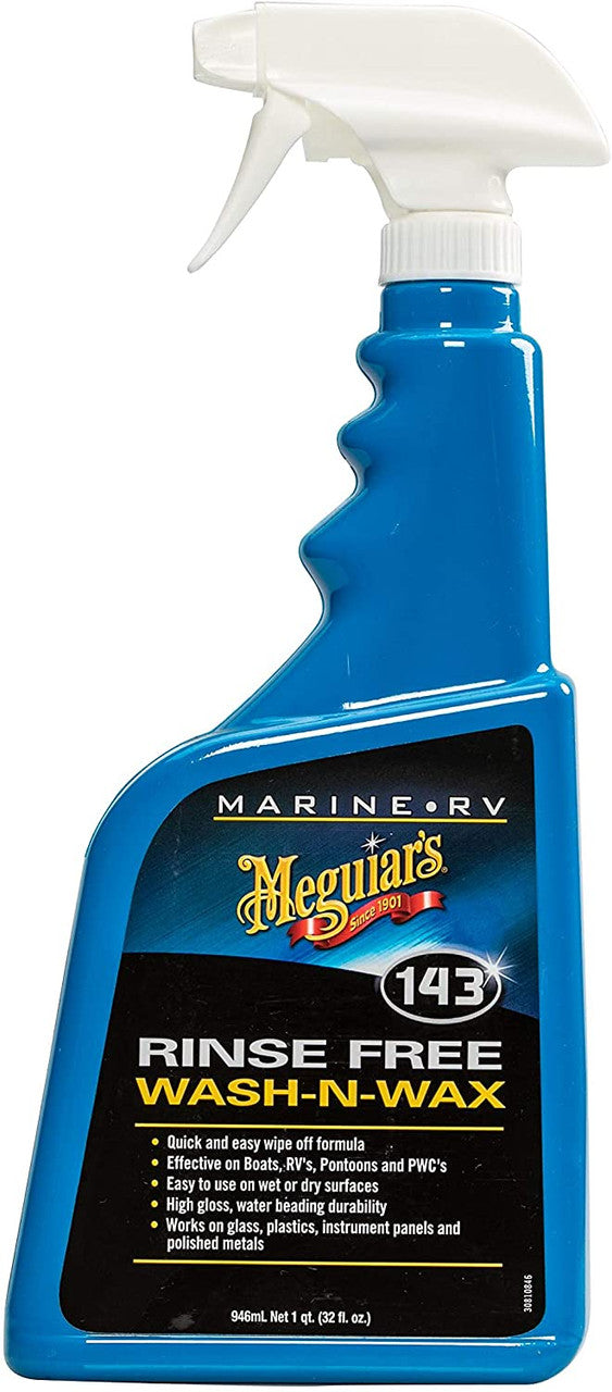 Is your Boat, RV, Pontoon or PWC too dirty for a detailer? No hose, bucket or water? No problem! Meguiar's® Rinse Free Wash-N-Wax safely lifts away dirt and grime while leaving behind a high gloss layer of hydrophobic wax. Safe and effective on glass, plastic, instrument panels, polished metals, fiberglass, gelcoat, and clear coat.