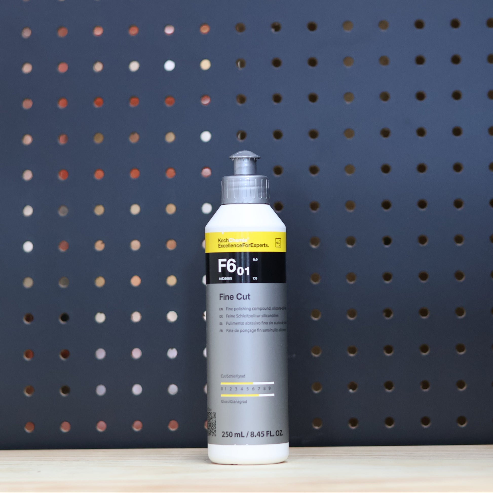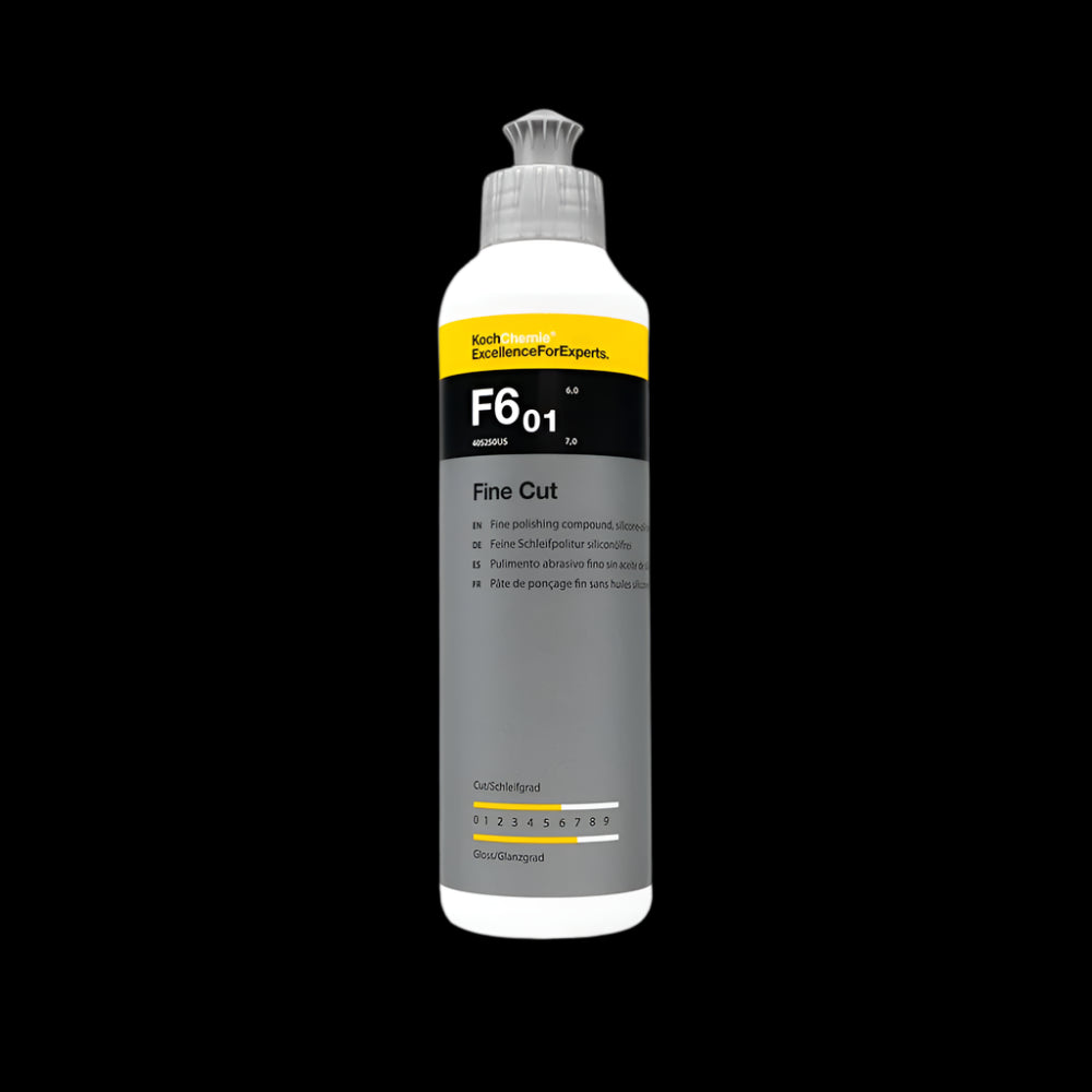 Koch Chemie Fine Cut F6.01 is an intelligent machine polish of the latest generation with unique aluminum oxide quality. The intelligent grain size ensures very quick, complete removal of wash system scratches and similar traces of use and gives the paintwork a long-lasting deep sheen. Sanding marks left behind by 2500 grade sand paper are removed effortlessly. Fine Cut F6.01 is ideally suited for perfect reconditioning of medium to heavily weathered paintwork. Perfectly coordinated for the treatment of scratch-proof paint Cut 6.0 Gloss 7.0