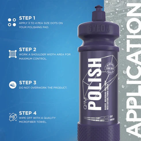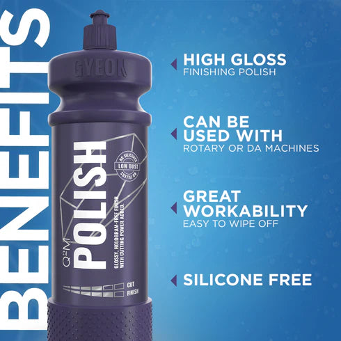 Q2M Polish is a high quality and fine finishing polish to bring out the most gloss and clarity of your paint system. With a medium level of cut and high level of finish it is also a great one step polish using low oils, no fillers, and high quality diminishing abrasives.