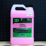 3D Final Touch performs better than advertised. This high lubricity formula makes removing light dust and other light contamination as safe as possible.  Using clean, uncontaminated microfiber towels is the other key ingredient to wiping down scratch-sensitive paint safely and that aspect is up to you. Besides providing excellent lubrication, 3D Final Touch also makes smooth surfaces clear, shiny and glossy while at the same time imparting ingredients that also make the surface slick and slippery and this is something 3D’s chemists excel at.