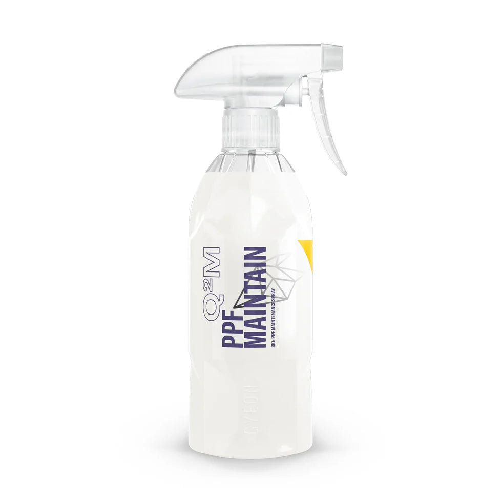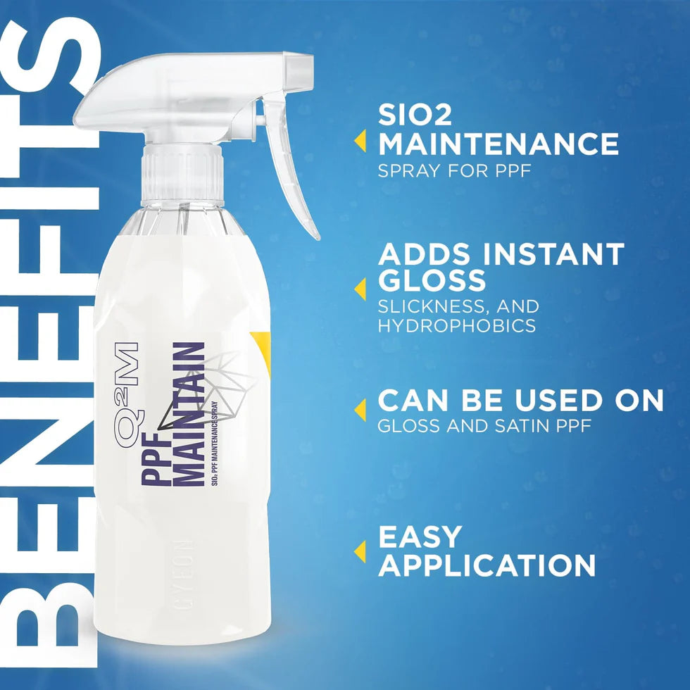 Q²M PPF Maintain is an SiO2 based maintenance spray designed specifically for paint protection film and vinyl. It will add instant slickness, self-cleaning, and hydrophobic properties to your film to keep it easy to clean and looking its best. As a top performing PPF sealant, this product can provide ultimate results for all paint protection films.