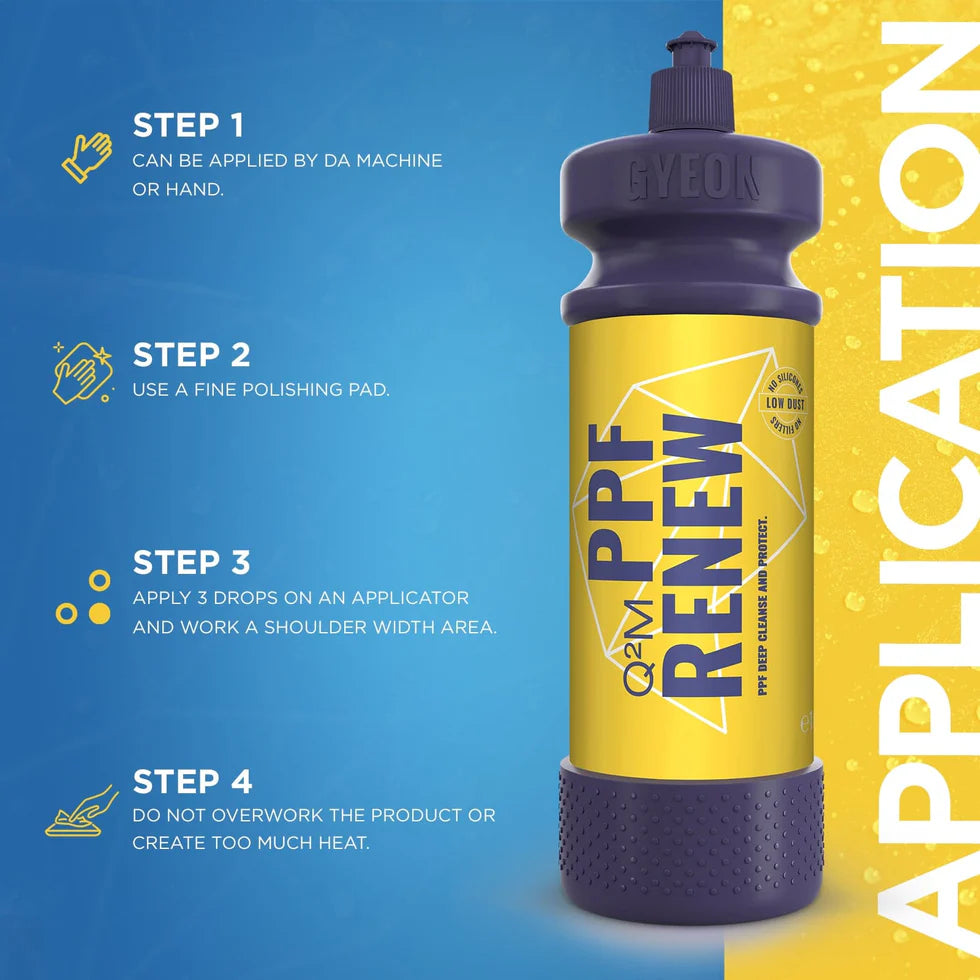 Even high quality, self-healing paint protection film becomes contaminated, dull and changes its initial smoothness over time. Gyeon Q²M PPF Renew brings a remedy to that. With its light abrasive properties, it is able to dramatically improve the level of gloss. The cleaning action of the PPF polish allows the removal of bonded contamination deep in the porous structure, restoring the initial slickness and smooth feel of the film.