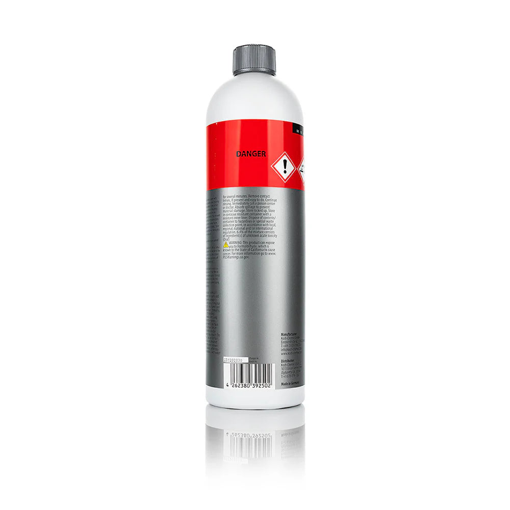 The powerful, alkaline wheel cleaner with exceptional dirt absorption capabilities and cleaning power. Using a complex combination of special dirt carriers and an alkaline solution, the dirt resulting from brake abrasion is quickly dissolved and dispersed, similarly to acidic wheel cleaners. The rim well is also thoroughly cleaned after just one application. The Alkali Wheel Cleaner generates minimal foam for excellent moistening and minimal fogging. These properties make it possible to quickly and thoroughly clean the wheels without irritating skin. Quick-separating in accordance with ÖNORM 5106.