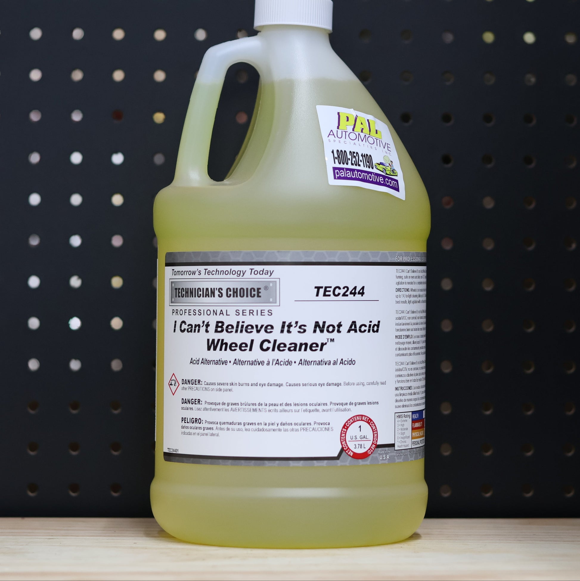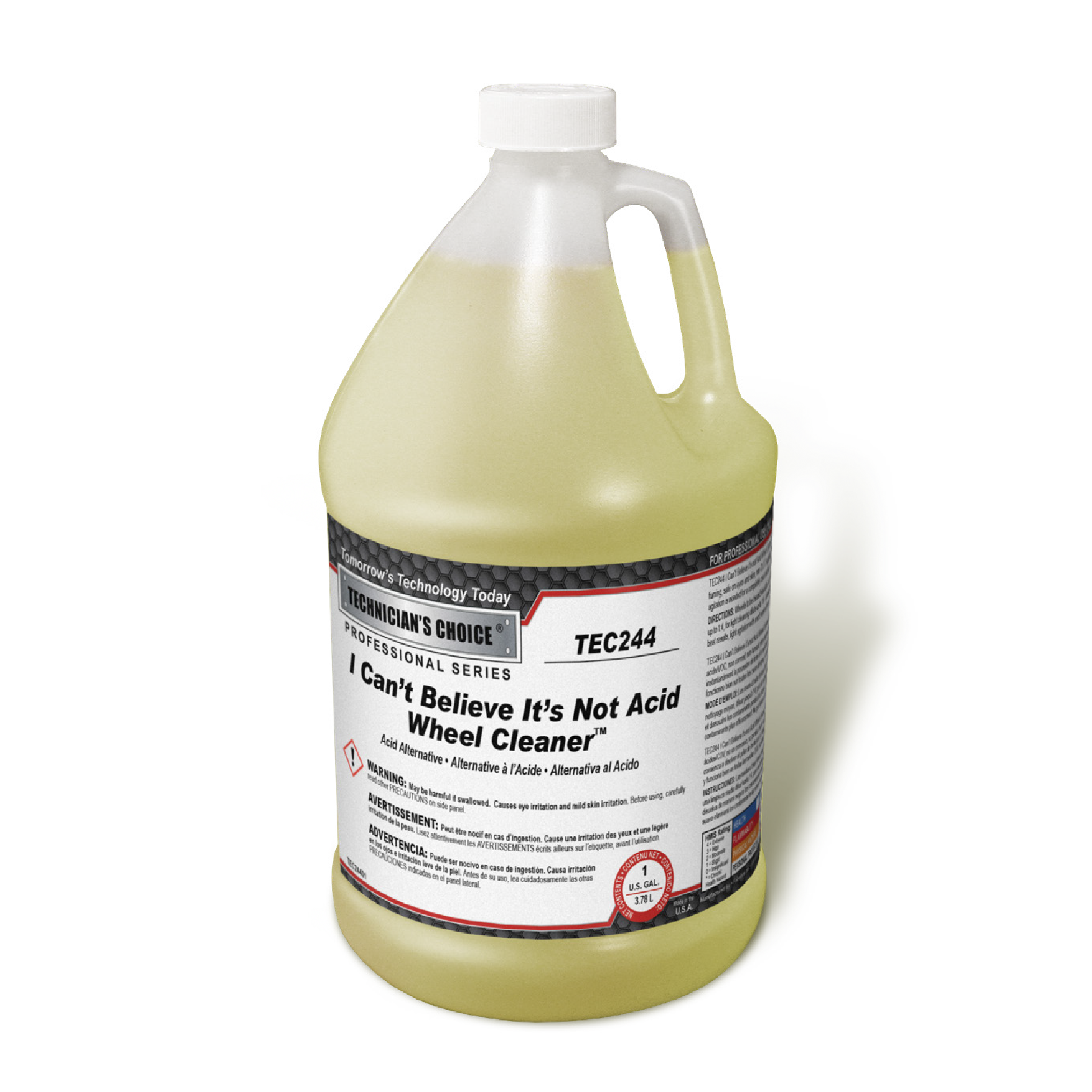 TEC244 I Can™t Believe its not Acid Wheel Cleaner„ utilizes a revolutionary new chemistry which works as fast as traditional acids but is 100% acid/VOC free, non-corrosive, non fuming, safe on eyes and skin, non-D.O.T. regulated, and 100% biodegradable. TEC244 acid alternative instantly starts to dissolve brake dust and grime upon contact. Only light agitation is needed for a completely clean surface. The product has minimal smell and works well on all OEM wheels, including brake calipers and supporting hardware.